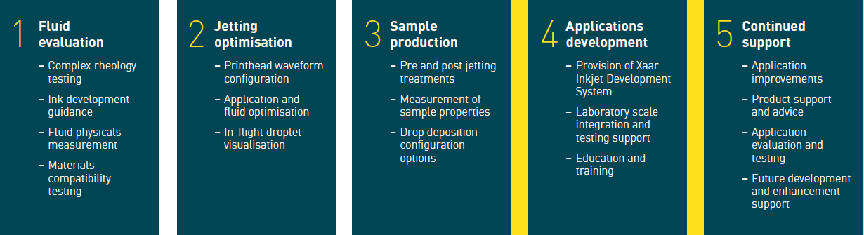As an inkjet innovator, we are focused on developing these applications using the technology built into Xaar’s latest range of Advanced Manufacturing (AM) printheads which allows inkjet to be applied in both scanning and single-pass modes, making digital inkjet printing a realistic choice for high output in-line batch and roll-to-roll production. We have a professional team working closely with manufacturers, fluid formulators and specialist printer makers to bring these new processes to market with our printheads and technologies.