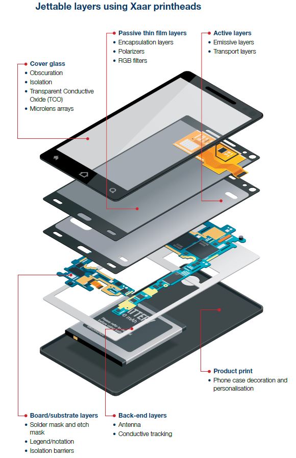 As an example, the schematic opposite illustrates the versatility of Xaar printheads to jet functional fluids for a wide array of deposition processes involved in mobile phone manufacturing.